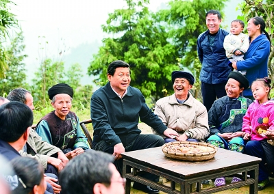 在湘西州花垣县排碧乡十八洞村,习近平到苗族贫困村民施齐文家中看望,坐下来同一家人算收支账,询问有什么困难、有什么打算,察看了他家的谷仓、床铺、灶房、猪圈,勉励一家人增强信心,在党和政府关心下用勤劳和智慧创造美好生活。