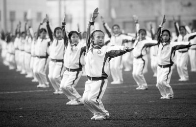 天津师范大学第二附属小学的学生在进行小学广播操《七彩阳光》的展示。 新华社发 刘东岳摄