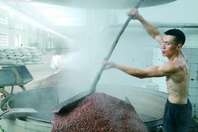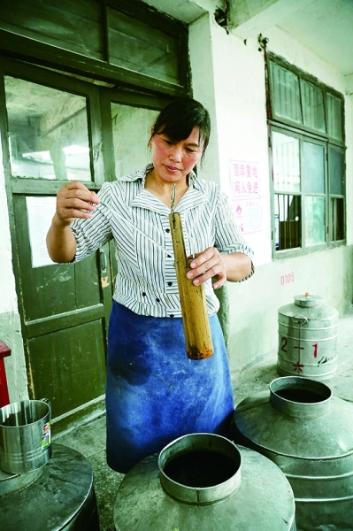 走在厂区里,可以看到许多建筑物的外墙布满了黑色的酒苔,这是多年酿酒形成的景象,酒库的外墙更是看不到一点白色了。酒库内,一排排的大缸像战士般整齐地站立着,几十年的老酒被封存在大缸里,一位工人正在细心检查酒缸的密封情况,整个酒库里都有一种诱人的气息。厂区的负责人说,这些老酒都是宝贝,它们被小心地保护,有计划地投入市场。