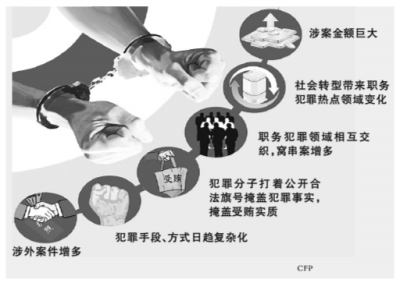 最高人民检察院职务犯罪预防厅厅长宋寒松表示,近些年职务犯罪不断出现新问题:职务犯罪多发部位随着资源配置的需求、经济产业政策导向和国家投资重点的变化而移动,且向新的领域发展蔓延;一些职务犯罪直接损害民生民利,成为诱发、激化社会矛盾的“导火索”;涉外案件增多,“裸官”犯罪现象突出,贪官潜逃问题严重;此外,一些非公经济组织向国家工作人员行贿,社会组织、中介和行业协会等从业人员居中斡旋,介绍贿赂。