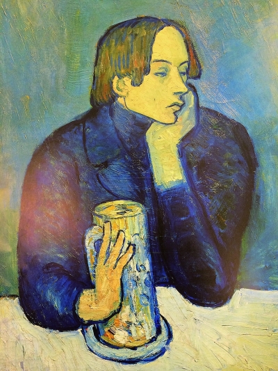 我最欣赏的一幅,是毕加索的一张男子画像,那是1901年间画的,正是他的蓝色时期。画里蓝色背景前,一个穿蓝色高领同色外套的男子,左手托腮右手扶着大啤酒杯,两侧头发垂到耳际,瘦削的脸上两道剑眉,细长的尖鼻子,翘嘴唇,兜下巴,他那忧郁的眼神特别吸引我的目光。画中的男子和毕加索是最好的朋友,他是一位作家。那时两人在巴黎都穷困潦倒,又爱上了同一个女孩子,最后那个女孩子跟了毕加索,而作家年纪轻轻就自杀身亡了。