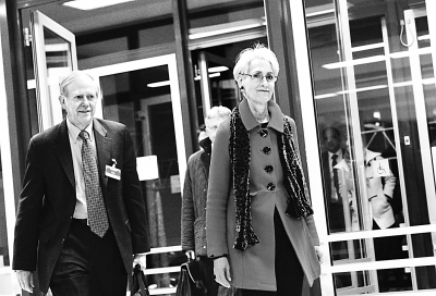 11月20日,在瑞士日内瓦万国宫,美国主管政治事务的副国务卿舍曼(右)步入全体会议现场。当日,美国、英国、法国、俄罗斯、中国和德国六国与伊朗在日内瓦举行新一轮伊朗核问题对话会,寻求解决伊核问题的实质进展。 新华社发