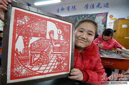 河北省邯郸市特殊教育学校的聋哑学生在展示剪纸作品。该校12月2日举行“我能行,我快乐”活动,同学们通过剪纸、十字绣、太极拳、舞蹈等项目展示才艺。郝群英摄/光明图片