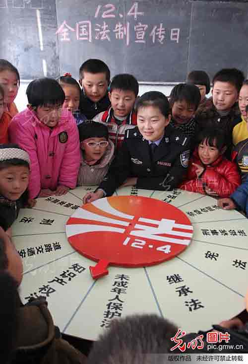 12月4日是全国法制宣传日,山东省枣庄市山亭区山城街道司法所工作人员走进校园和小学生一起玩普法转盘,向小学生普及法律知识。张强摄/光明图片