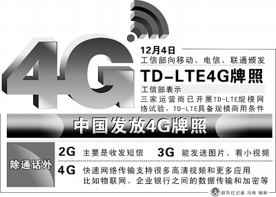 本报北京12月4日电(记者杨君)工业和信息化部4日向中国移动、中国电信和中国联通三家运营商颁发“LTE/第四代数字蜂窝移动通信业务(TD-LTE)”经营许可,标志着我国通信行业迈进4G时代。