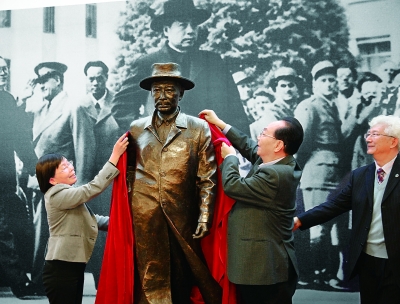 12月4日,在北大百周年纪念讲堂,嘉宾为周恩来铜像揭幕。当日,“你是这样的人——纪念周恩来诞辰115周年珍品展”在北大开展。 新华社记者 王申摄