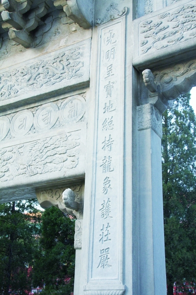 塔前牌楼阴面楹联为:“象教演浮提常住因缘万归一;鹫光印乾竺大乘示现幻皆真”。横批是“妙谛真空”。