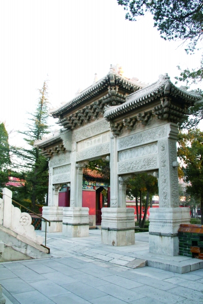 塔前塔后牌楼,建筑形式相同,均呈屋宇式,主要以汉白玉石建成,并雕有梵文“六字真言”和精美的“八瑞相”图案,在北京古建筑中独树一帜,特色鲜明。