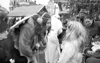 12月6日,捷克首都布拉格老城广场上,许多市民和游客戴着发光的魔鬼角和雪白的天使翅膀,欢度圣尼古拉斯节。该节是西方国家一个重要宗教节日,人们装扮成圣尼古拉斯、魔鬼和天使,询问孩子们一年来的表现。孩子们要唱一首歌或朗诵一首诗给“圣尼古拉斯”听,表现好的孩子会得到糖果,表现不好的孩子会被告知将被放入“魔鬼”的袋子中并被带到地狱去。圣尼古拉斯是圣诞老人的原型,生前是公元四世纪的土耳其主教,也是一位慈善家,因慷慨而被人们爱戴。图为美丽的“天使”在倾听一位小女孩朗诵诗歌。 本报驻布拉格记者 夏茂盛摄影报道