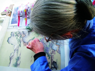 冬日的一个中午,在苏州高新区镇湖绣品街的一家绣艺馆里,身着传统蓝布衣、满头银发的七旬绣娘马惠荣正在气定神闲地绣着一幅山水图,一群来自贵州的大学生兴趣盎然地围在她身边不停拍照。她的女儿梁雪芳已经是远近闻名的工艺美术师,正给来访者讲述自己的绣艺创作。既懂绘画,又懂刺绣,拥有自己的原创作品,而非仅仅复制别人的画册,是梁雪芳在绣艺上日渐精进的一大基础。像她这样的新式绣娘在镇湖不止一位。镇湖,是苏绣的发源地,也是苏绣最重要的产地。这个太湖边2万人口的小镇,如今拥有8000多名绣娘。20世纪末,政府在这里投资建成长1700米的“绣品街”,集聚近500家绣庄,使镇湖形成生产、加工、销售一条龙式的链条产业,并通过产学研结合,为苏绣的长远发展不断蓄力。
