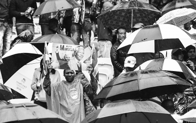 12月10日,在南非约翰内斯堡,南非民众在雨中参加前总统曼德拉追悼大会。南非前总统曼德拉追悼大会10日在约翰内斯堡的FNB体育场隆重举行,近百名各国元首、政府领导人以及约10万名南非民众冒雨参加。新华社发