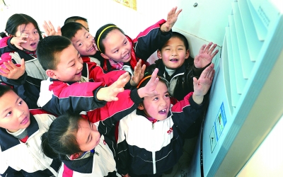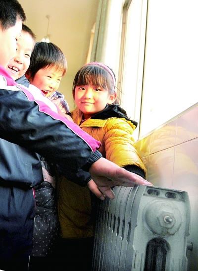 12月11日,山东省沾化县富国中心学校的同学们在教室内新安装的暖气上暖手。为了改善学习环境,该县今冬先后为66处农村中小学配备了空调、暖气、火炉等供暖设备,受到同学们的欢迎。本报记者 郭俊锋摄