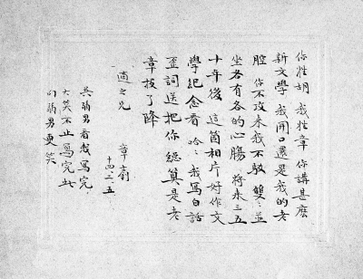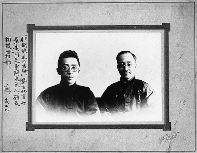 1925年2月,章士钊与胡适在一次宴会上不期而遇,饭后便一起照了这张合影。相片洗印出来,章士钊在相片背后题了一首白话诗送给胡适:“你姓胡,我姓章,你讲什么新文学,我开口还是我的老腔。你不攻来我不驳,双双并坐各有各的心肠。将来三五十年后,这个相片好作文学纪念看。哈哈,我写白话歪词送把你,总算是老章投了降。”在附信中章士钊还说:“弟有题词,兄阅之后毋捧腹。兄如作一旧体诗相酬,则真赏脸之至也。”而胡适果真在相片旁题了一首七言诗:“‘但开风气不为师’,龚生(此处指龚自珍——编者注)此言吾最喜;同是曾开风气人,愿长相亲不相鄙。”