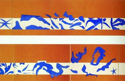 从右向左审视画面,起点和结束点都有一个海星图案,跳水者或游泳者形象的轮廓逐渐消融,而那些蓝色的形状开始被用以描绘溅起的水花,白色的空间却被用来表现抽象的人物。在主体与背景不断地相互交错的过程中,每一个游泳者都有节奏地游动、彼此相随,他们有时以一种优美的姿态突破了水平条带的束缚。马蒂斯把几个不同视角结合起来——从上方向下、往水中看,或者就像在水中那样往侧面看——这样一来,人物形象不同的姿势本身便决定了构图的整体性。这幅表现水上运动的图画充满了生机而又异常平静,它将艺术家毕生怀有的创造一个理想化环境的渴望最充分地表现了出来。