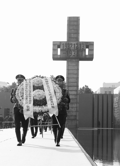 12月13日,武警战士向30万遇难同胞敬献花圈。当日10时,江苏省暨南京市各界人士、驻宁部队代表以及来自美国、菲律宾、日本、韩国等国家的国外友好团体、友好人士代表共约5000人,在侵华日军南京大屠杀遇难同胞纪念馆举行国际和平集会,悼念76年前在南京被侵华日军血腥屠杀的30多万遇难者。 新华社发