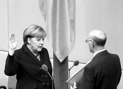 12月17日,在德国柏林国会大厦,默克尔(左)在联邦议院议长诺贝特·拉默特面前宣誓就职。德国联邦议院当天举行总理选举投票表决,默克尔再次连任新一届联邦政府总理。 新华社发