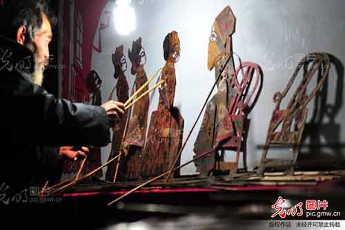 日前,湖北省宜昌市夷陵区民间艺人向德文在第二届皮影戏展演舞台的后台操作人物道具。如今,当地会表演皮影戏的艺人越来越少,皮影戏正面临失传的困境。 张国荣摄/光明图片