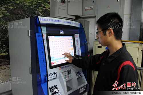 12月18日,在北京理工大学,一名学生正在自助售(取)票机上购买火车票。据悉,这是北京铁路部门在校园里安装的第一台自助售(取)票机。为方便学生订票、取票,铁路部门还将在中央财经大学、中国传媒大学、中国地质大学等16所院校免费安装自动售(取)票机19台。王振摄/光明图片