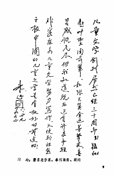 不只是我本人与《儿童文学》结缘很深,还有众多人对它一见倾心,从此结下不解之缘。且不说亲手创办了这本杂志的茅盾、叶圣陶、冰心、张天翼、严文井、金近诸位前辈,终其一生,像守护自己的孩子一样关爱着这本刊物。创刊50年,前前后后有一百多位编辑,不论是相伴走一程还是终其一生,哪一个不是竭心尽力,兢兢业业,甘愿奉献。还有数以千计的作者,无论《儿童文学》是在峰巅还是在谷底,始终不离不弃,把最得意之作悉数奉献。其中有从创刊第一期就在本刊上发表作品的著名老作家葛翠琳、金波、杨啸等等,至今已近耄耋之年,仍然笔耕不辍。另有一批少壮派作家,从《儿童文学》起程,无论他们走多远,始终视《儿童文学》为家,这就是他们倾心守护的精神家园。还有那些父子作家、母女作家,《儿童文学》与他们结下的是世代情缘。现在杂志社里还珍藏着一张照片,上面有两位中国作家协会主席,很多人都认不出那个梳着两条辫子、眼睛大大的姑娘就是现任的中国作家协会主席铁凝。当年她初出茅庐,和一批《儿童文学》讲习班的学员一起去拜访时任中国作家协会主席的茅盾先生。