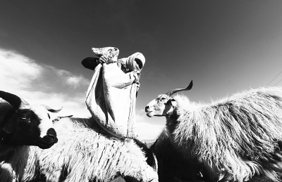 12月24日,青海省海北藏族自治州刚察县沙柳河镇新海村村民拉毛措在给羊群添饲料。国家自2011年起,每年安排超过19亿元资金在青海实施草原生态保护补助奖励机制,鼓励牧民合理放牧、保护生态。政策实施两年多来,青海共完成禁牧减畜任务456万羊单位,局部草原生态环境改善。新华社记者 张宏祥摄