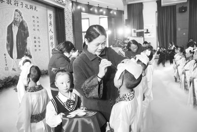| 合肥逍遥津小学拜师礼,老师正给学生“点朱砂” 杨子龙摄 |