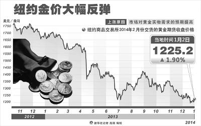 中国社会科学院也在近日发布的世界经济黄皮书《2014世界经济形势分析与预测》中称,2014年全球黄金价格继续下降的可能性要显著大于价格反弹的可能性。有分析认为,随着今年美联储延续退市,加上美股上扬,资金将抽离黄金等商品市场,估计2014年金价将在1000至1300美元/盎司之间震荡。