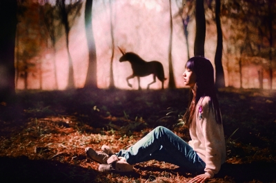 我热衷于把一些生活中无法出现的场景通过我的照片重塑出来。其实在拍摄这些照片的时候,我并没有考虑太多成片以后的画面,只是简简单单地拍照。在用底片拍摄并拿到扫描后的照片后,我会发现每一幅照片都会告诉我它们自己想要表达的东西。比如那张女孩和独角兽的照片,原图背景树林中有一个空缺,女孩的表情柔和迷离,我马上想到了独角兽这个元素,并在后期合成中加入其剪影,一张本来很单调的照片就这样变得更有意味了。