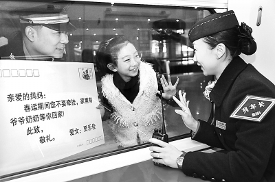 1月12日,列车长贾慧斌(左)和女儿贾乐佳一起到车站给出乘的妈妈送上家书。贾慧斌、李鹏夫妇分别是郑州铁路局郑州客运段K869次和G562次列车的列车长。2014年春运期间,他俩与单位的800余对夫妻一样,放弃了与家人团聚的时间,分别在春节前后的69对固定列车和80余对临客列车上担当任务,以保障春运期间千千万万乘客平安回家。新华社发(张强摄)