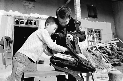 为使孤寡老人和留守儿童开心过新春佳节,广州铁路公安局衡阳铁路公安处团委组织青年民警在辖区内开展了一场“心系老人 情暖儿童”系列活动,让孤寡老人和孩子都能感受到爱的温暖。图为衡阳铁路公安处青年干警给留守儿童送来新书包。 徐福昌、文枫摄 光明图片
