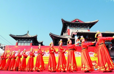 2月1日,在兰州春节文化庙会的开幕式上,来自兰州市歌舞团的演员们在表演《顶碗舞》。 新华社记者 郭刚摄