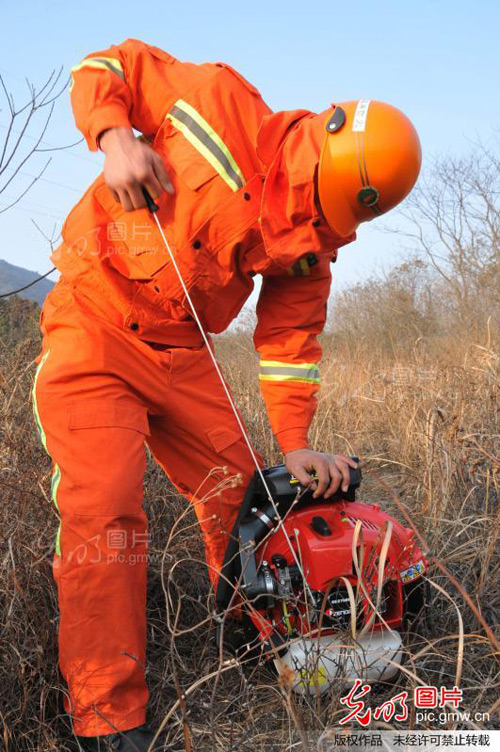 日前,武警安徽省总队第二支队举行森林火灾抢险灭火演练,提升官兵处置大型森林火灾的能力。安徽省巢湖市森林、植被占地面积大、覆盖面广,地形复杂,防火形势严峻。进入冬季后,该支队加强与地方林业部门联系,清除火患苗头,确保春节期间人民群众生命财产安全。图为一名灭火队员启动风力灭火机。徐伟摄/光明图片
