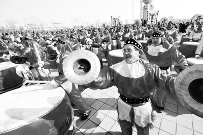 日前,一支由108面大鼓、600多名农村文艺骨干组成的威风锣鼓队在山东省滨州经济技术开发区黄河明珠广场为群众表演威风锣鼓“九龙翻身”,迎接元宵节的到来。本报记者 郭俊锋摄