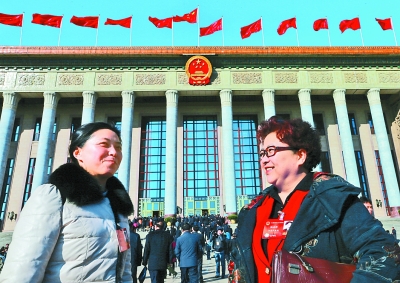 3月4日,十二届全国人大二次会议预备会在北京人民大会堂召开,江苏代表团陆亚萍代表(右)和李叶红代表(左),在会场外交流陆亚萍代表《关于净化网络环境的建议》,探讨加强网络安全教育,加强网络监督监控自身建设等问题。本报记者 刘新武摄