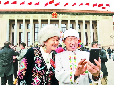 三月十二日,全国政协十二届二次会议在北京人民大会堂举行闭幕会。这是闭幕会后,全国政协委员海丽曼(左)和全国政协委员步祁德才用手机拍摄纪念照。本报记者 郭俊锋摄