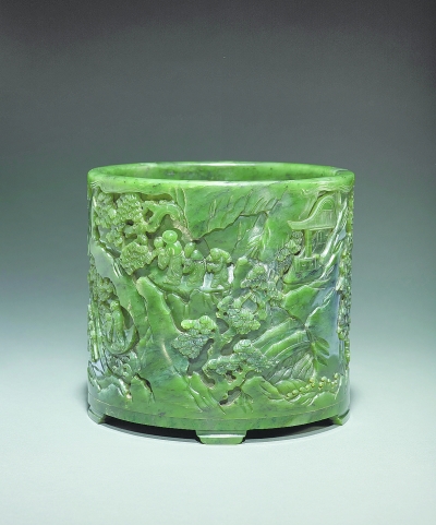 此件笔筒从其实用功效上来讲当属文房用具。文房用具成熟于宋代,宋代国策重文抑武,文士阶层地位提高,受到普遍的敬重。于是文人的生活美学影响愈巨,由此文房艺术应运而生。明代经济发展,民间富裕,于是文人与文化有了契机,蓬勃向上,文人品味也随之成为时尚。商人富贾、官僚帝王争相附庸风雅,文人之美普及于世。清朝以来,康乾盛世,三朝帝王皆具学养,喜好艺术,于是亲自参与了诸多器具的设计,故出现于宫廷中之器具,必是符合帝王审美与需求的。帝王虽亦可称为文人,但贵为天子,深居内宫,宫廷的壮丽建筑及雕梁画栋的内部陈设,均是宣扬国威、粉饰帝王气派与好尚。御用文房器具陈设其间,无论从应景之道来讲,还是从理念上来说,亦必须突显其富贵豪华。尤其当帝王重视艺事且文品甚高之时,往往利用充裕的国府资财,招揽各地能工巧匠,取用各处精美材质,倾力督造巨硕纤巧之作品,亦可令不同品类之工艺竞技交流,由此激荡出前无古人之作,诚为民间不可想亦不可能之事。清高宗乾隆皇帝在其诸多诗文当中,屡屡流露出他对于王羲之、陶渊明、苏东坡等文士的追慕与敬仰,正因如此文人思想之熏受,他在对于玉器的品位方面也以传袭古典、表现画意为雅。此件笔筒选材精致,制作严谨,气韵恢宏,有富贵艳丽之皇家气息,又因碧玉色沉,故体度庄沉,具典型宫廷风格。由此齐集文人品味与宫廷风格,后人无所企及。