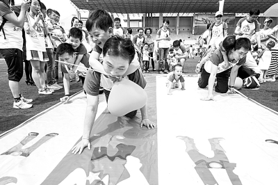 5月1日,在天津南开大学附属中学体育场举行的“童话奇缘”亲子趣味运动会上,家长和孩子在参加“牛仔很忙”比赛。