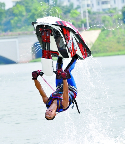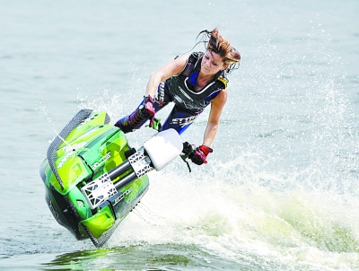 6月2日,在广西南宁相思湖,一批来自法国、美国、比利时、澳大利亚等国家的顶尖摩托艇选手为观众奉献了一场精彩的水上摩托艇花样表演。 新华社发(喻湘泉摄)