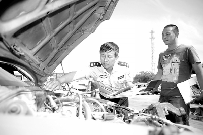 6月4日,银川市交通警察分局车辆管理所民警在对报废车辆进行身份信息核查。近期,该所采取“双民警”报废车辆核销制度,由两名民警分别对报废车辆身份信息进行核准、对销毁后车辆主要部件的损毁情况进行查验,杜绝报废车辆重新流入社会。新华社记者 王鹏摄