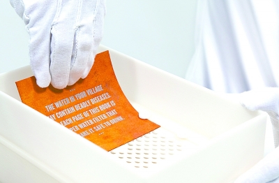 美国科学家研发了一种可以用来滤水的书。人们可以将该页撕下来浸入水中,书页表面的纳米银能够杀死大部分细菌,过滤出来的水基本能达到北美饮用水标准,每一页的滤水量达到100升。CFP