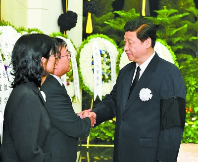 六月二十二日,王文元同志遗体在北京八宝山革命公墓火化。习近平、张德江、俞正声、刘云山、王岐山、张高丽等前往八宝山送别。这是习近平与王文元亲属握手,表示深切慰问。新华社记者 李学仁摄