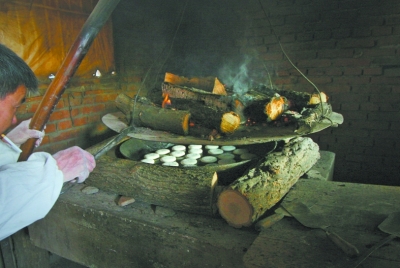 烤麻酥在用火上比较独特的地方在于,它是将炭火放在锅盖上烧,麻酥则是放在锅里烤的。这样的加热方式,使得麻酥外皮稍硬,用力才能压碎,所以能把麻酥整箩筐放在一起而完好无损。麻酥又是中间空空的,内壁粘有红糖,送到嘴里嚼起来清脆酥香,还夹带犹如巧克力般丝滑的口感。如制作生坯时表面再撒些黑芝麻,成品麻酥就有了如草莓一样的满脸麻子,还增加了芝麻糊的香味。