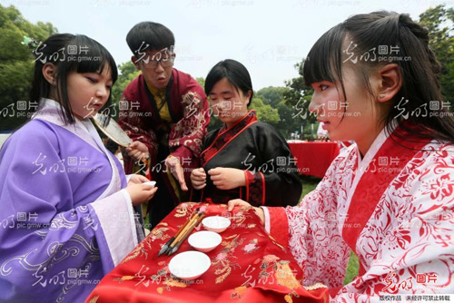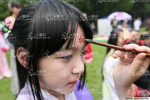 6月29日,江苏省南通桃坞汉服社在文峰公园内举行中华女子传统成人礼活动。来自南通市区各个学校的高考学子志愿者身穿华夏传统民族服饰,通过加笄、花钿、诵读誓词等仪式宣告成年,体验中华民族传统文化。图为女学生们正在进行花钿环节。