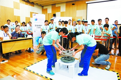 在数据传输命题中,比赛载体由传统的PC端换成了更常用的手机移动端,每支参赛队伍配发两台安卓系统手机,使用二维码、超声波等新型传输方式,在不使用手机现有通信模块及通信软件的前提下完成数据传输。而今天最具可看性的比赛,当属安全保护命题。为提升比赛难度,承重结构的制作由桐木条更换为A4纸,比赛规则也变更为在承受固定重量的基础上结构质量更轻者为胜。在比赛现场,一个个结构精巧的纸质结构承受重压而巍然不倒,着实令人难以将其与轻薄的纸张联系在一起,现场不时爆发出阵阵赞叹。