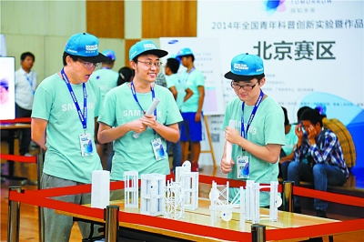 “2014年全国青年科普创新实验暨作品大赛”由中国科协科普部和共青团中央学校部共同主办。在科普实验单元的比赛中,数据传输、风能利用、安全保护三大命题均在去年的基础上进行全面升级。学生们制作的参赛作品较上年有很大提升。