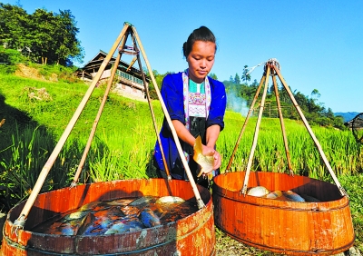 9月21日,广西三江侗族自治县良口乡晒江村的一名侗族妇女将抓获的“高山稻鱼”进行分装。晒江人素有“种稻养鱼”之传统,是三江“高山稻鱼”的发祥地,其养殖的“晒江禾花鲤”以肉质鲜美而著称,曾为历代朝廷“贡品”,目前该村共有稻鱼示范基地460亩,已形成集鱼苗繁殖、稻鱼种养、产品销售于一体的致富产业链。龚普康摄/光明图片