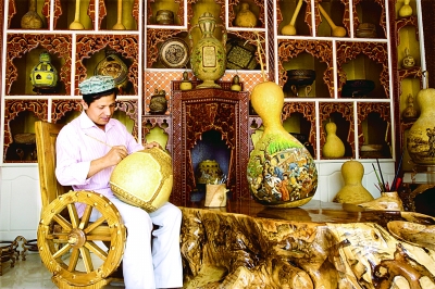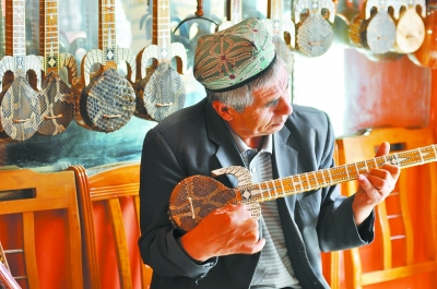 虽然新疆人都热爱音乐,但是没有一个地方像和田那样拥有那么多由专业音乐家组成的小乐队。十二木卡姆共分12套套曲365首曲子4500行诗,演唱每套套曲至少需要两个小时。套曲巧妙地运用音乐、文学、舞蹈、戏剧等各类艺术形式,表现维吾尔族人民绚丽的生活和美好的追求。在和田行走,我经常听到优美的木卡姆的旋律。在墨玉县的夏合勒克庄园,几个维吾尔族人随意地坐在一张木床上,弹奏着手中的乐器,艾捷克、达普(手鼓)、萨塔尔、热瓦甫、塔西、沙巴依、阔捂子、巴拉曼、乃依、胡西塔尔、塔布拉、冬不拉、都塔尔、弹布尔、卡龙琴、纳格拉……粗粗数一下,和田的民间乐器就有十几种之多。热瓦甫是一种弹拨乐器,比较轻巧;巴拉曼是一种用芦管做成的双簧气鸣乐器,中间有几个孔,类似于笛子;都塔尔也是一种弹拨乐器,有两条弦,琴声清脆、悠扬,这些乐器有的用来独奏,有的用来合奏,有的用来伴舞和鸣。维吾尔族民间乐器不但可做伴奏的乐器弹奏音乐,还可作为一件精美华丽的工艺品来展示,经主人的手工制作和装饰的乐器,显得简单古朴,高贵典雅。