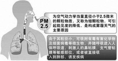 近年来,被称为“灰霾元凶”的空气污染物PM2.5受到全社会广泛关注。气象专家和医学专家均认为,PM2.5对健康的危害尤其严重。中国工程院院士钟南山曾在多个场合表示,PM值在5微米,就可以到达气管、支气管;到1微米~3微米时,就会进入肺泡,并永远停留在肺泡里。首都医科大学肺癌诊疗中心主任支修益则提出,由于PM2.5的化学成分众多,除影响空气能见度外,可经呼吸道进入肺部、进入血液,对人体呼吸、心脑血管系统等造成重要影响,婴幼儿、儿童、老年人、心血管疾病和慢性肺病患者对其更为敏感。环境保护部也在《中国公民环境与健康素养(试行)》中指出,当空气污染物浓度过高时,人体会由于短期内吸入大量的污染物而产生急性健康危害。