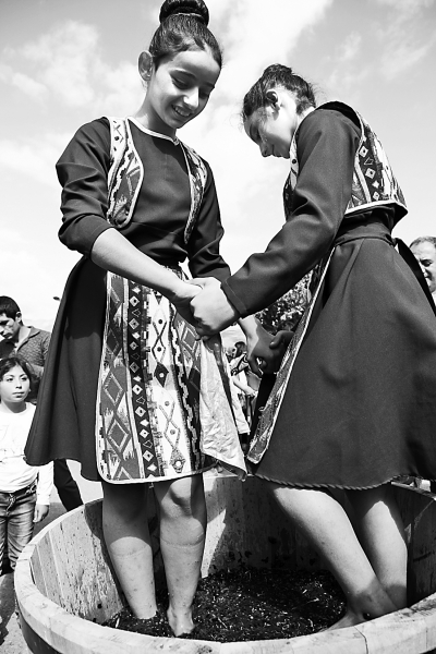 一年一度的葡萄酒节10月4日在亚美尼亚首都埃里温南部的阿列尼村隆重举行。亚美尼亚葡萄酒节已连续举行5届。从今年开始,葡萄酒节正式改名为“阿列尼葡萄酒、面包和传统工艺品展示节”。图为两名少女按习俗踩踏当年丰收的葡萄。 新华社发