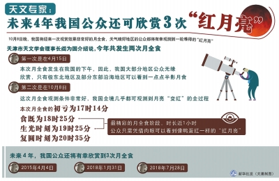 对此,北京天文馆馆长朱进也表示,今年全球共发生两次月食,但4月份出现的那次月食我国境内几乎无法观测,10月8日是今年我国境内观看月食的唯一机会,本次观测的时间在初秋的傍晚,时间适宜,且我国境内大部分地区可目测到。月食开始时月亮又比较接近地平线,观赏效果好,所以备受关注。