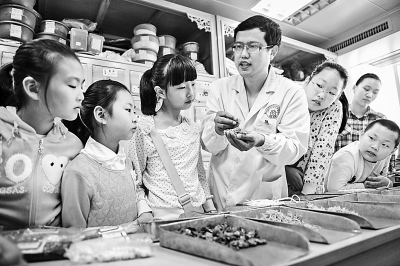 10月19日,在五里墩街道社区卫生服务中心,中医周明明(中)在教小朋友识别中药材。为迎接10月22日“世界传统医药日”,合肥市五里墩街道清溪路社区组织辖区内的小朋友学习识别中药材,观看把脉、拔罐等中医疗法,了解中医药知识,感受传统中医的魅力。 新华社记者 张端摄